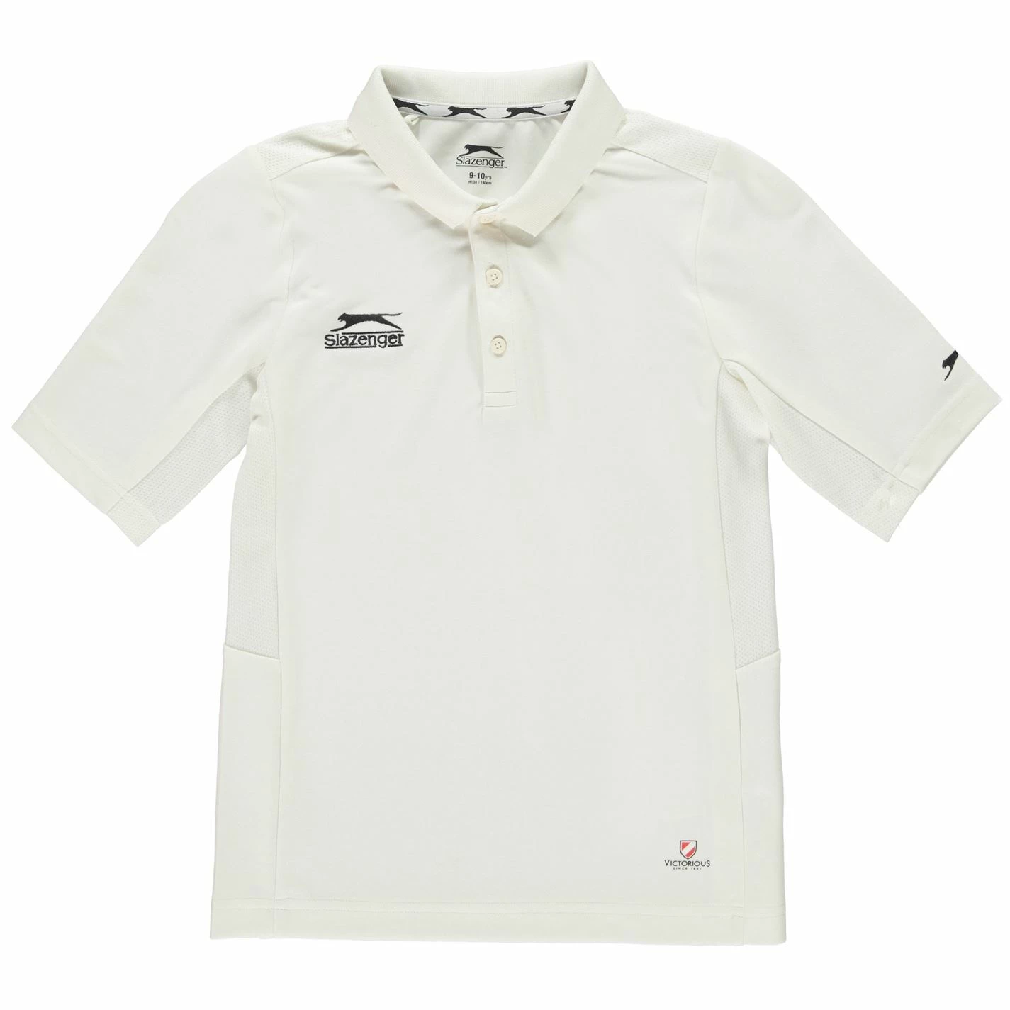 Grab a classic look out on the field with this Slazenger Three Quarter Cricket Shirt, which features a regular fold down collar, three button fastening, short sleeves, mesh panelling for ventilation and smart colour contrasting piping to the arms and placket. The shirt, which uses moisture wicking technology to draw sweat away from the skin to keep the wearer dry, is completed with the Slazenger logo to the front and back.